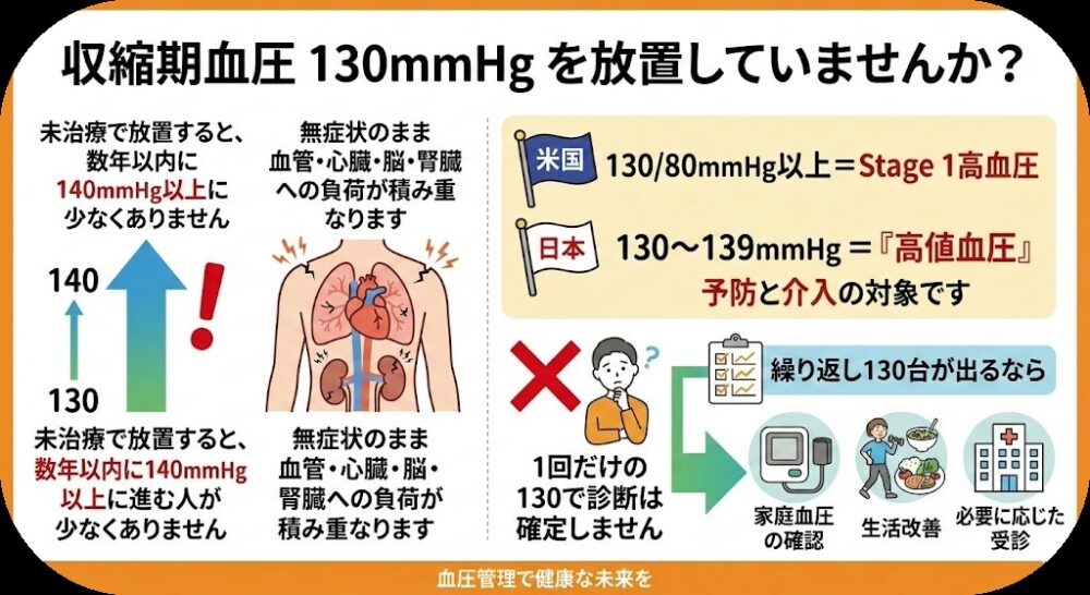 実は米国では、130/80mmHg以上をすでに「Stage 1高血圧」と定義しています。日本でも130〜139mmHgは「高値血圧」と呼ばれ、予防と介入(治療や生活改善)の立派な対象なんですよ。