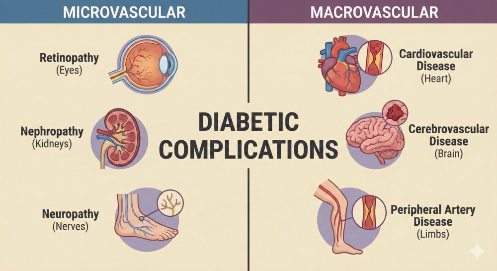 糖尿病が怖いのは、病気そのものよりも、高血糖によって全身の血管がボロボロになることで起きる「合併症」です。